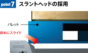 荷物を載せやすくするため、ヘッドの角を斜めにカット。またパレットがヘッドに干渉した場合、斜めにスライドし、ヘッド部分の損傷と衝撃による本体の変形を防ぎます。